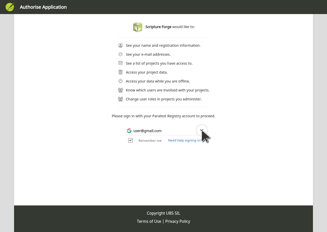 Als Nächstes autorisiere Scripture Forge, sich mit Deinem Paratext-Konto zu verbinden. Wenn Du dazu aufgefordert wirst, gib die E-Mail-Adresse ein, die mit Deinem Paratext-Konto verbunden ist, und klicke dann auf den Login-Pfeil (oder drücke die Eingabetaste)