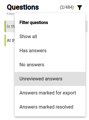 Wenn Du Antworten finden möchtest, die nicht für den Export oder als erledigt markiert wurden, findest Du mit dem Filter oben auf der Liste der Fragen Nicht überprüfte Antworten.