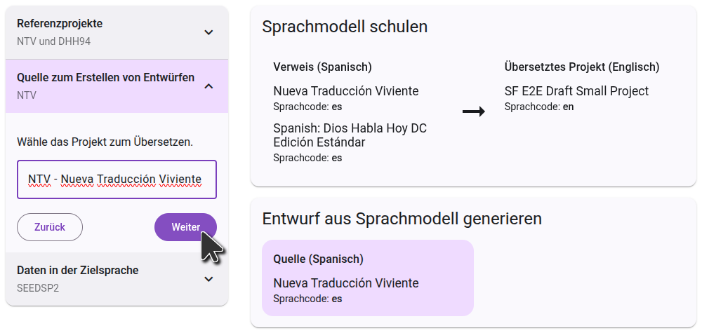 Auf der rechten Seite siehst Du ein Diagramm, das zeigt, wie die von Dir ausgewählten Projekte zur Generierung des Entwurfs verwendet werden. Im ersten Schritt lernt das Sprachmodell aus dem Vergleich zwischen den Referenzprojekten und dem übersetzten Projekt. Im zweiten Schritt nutzt es dieses Wissen, um das Ausgangsprojekt zu übersetzen.