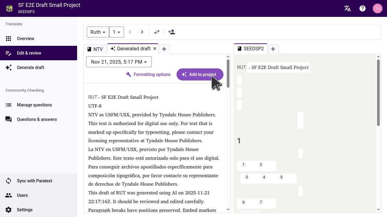 To compare the draft to the text it was translated from, set a source on the settings page. This will allow you to see a source and the resulting draft side-by-side.