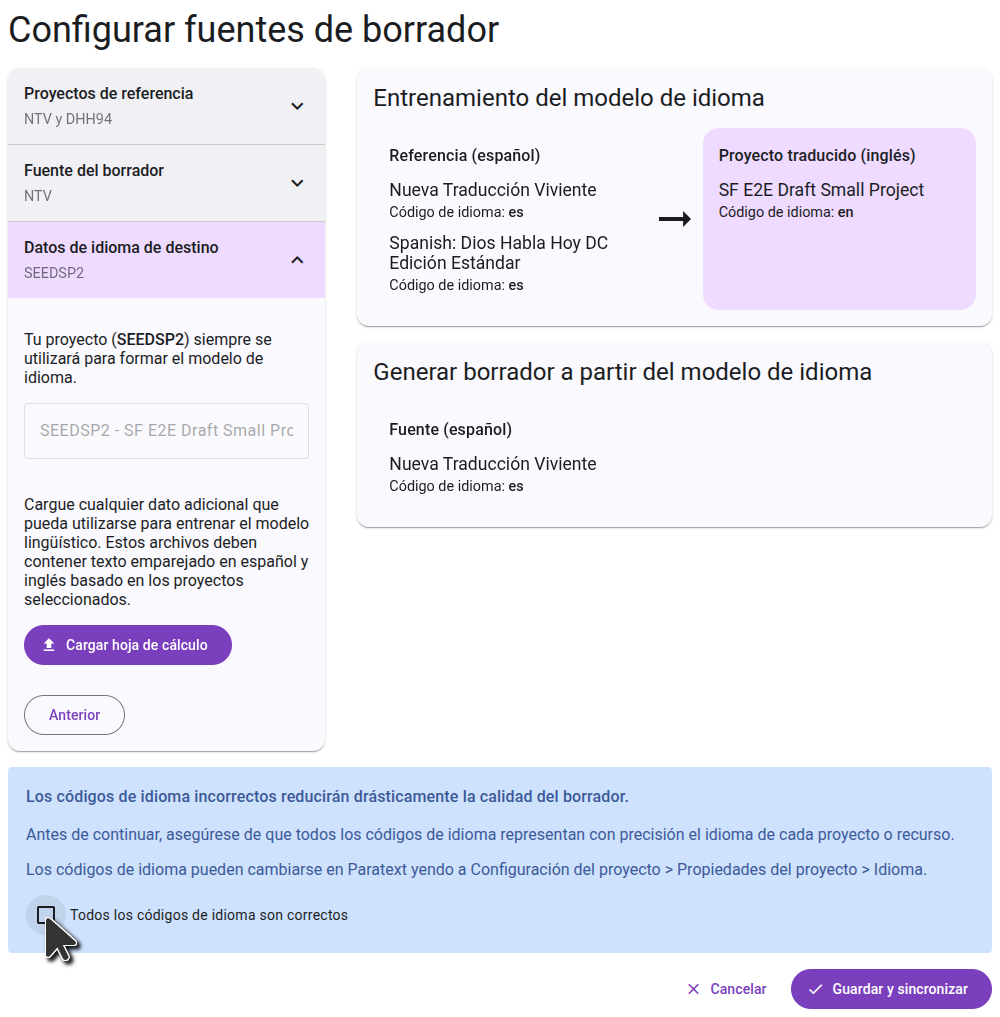 El paso final muestra los datos del idioma de destino. Esto incluirá siempre su propio proyecto, que ya está seleccionado y no puede eliminarse. Puede añadir datos de entrenamiento adicionales en este paso cargando una hoja de cálculo con datos emparejados, con el idioma de fuente en la primera columna y el idioma de destino en la segunda.