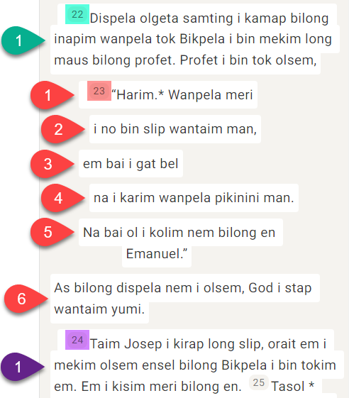 En Scripture Forge, un segmento es una sección de las Escrituras que debe traducirse. Puede tratarse del título de una sección, de un verso o de una parte de un verso (como en la poesía).