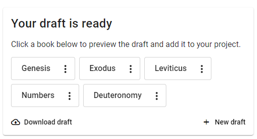 - Vous pouvez ajouter le livre entier en naviguant vers « Générer une ébauche » et en trouvant l'ébauche qui a été généré. Cliquez sur le menu à 3 points disponible à côté du nom du livre que vous souhaitez ajouter, puis cliquez sur « Ajouter au projet ». Cela va ajouter tout le livre à votre projet