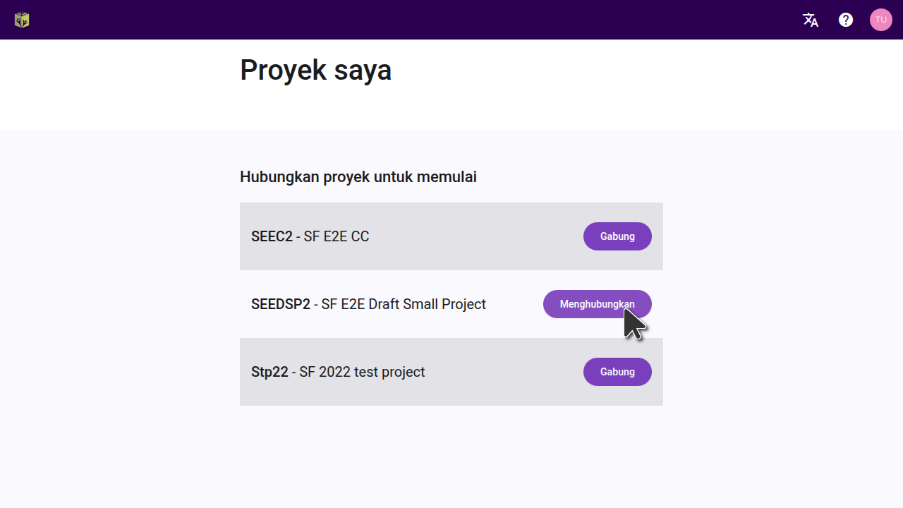 Dari daftar yang ditampilkan, Anda akan dapat membuka proyek jika sudah terhubung. Anda juga dapat bergabung dengan sebuah proyek atau klik "Hubungkan" untuk menghubungkan sebuah proyek untuk pertama kalinya di Scripture Forge.