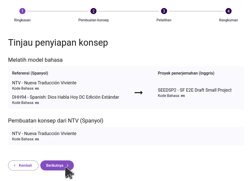 On the first screen, review the configured sources and language codes and verify that they are correct. Then go to the next step.