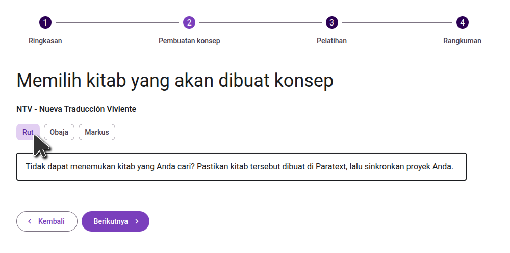 On the second step, select the books you want translated. If the book you want to draft does not exist in your Paratext project, you will need to create the book in Paratext first. In general we suggest drafting one book at a time, though if you are drafting smaller books, you may want to draft several at a time.