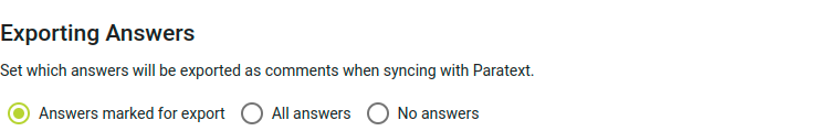 Jika Anda lebih suka semua jawaban diekspor ke Paratext tanpa menandainya satu per satu untuk diekspor, buka pengaturan proyek dan temukan bagian Mengekspor Jawaban. Opsi standar adalah hanya mengekspor Jawaban yang ditandai untuk diekspor, tetapi pengaturan ini dapat diubah menjadi Semua jawaban atau Tanpa jawaban.