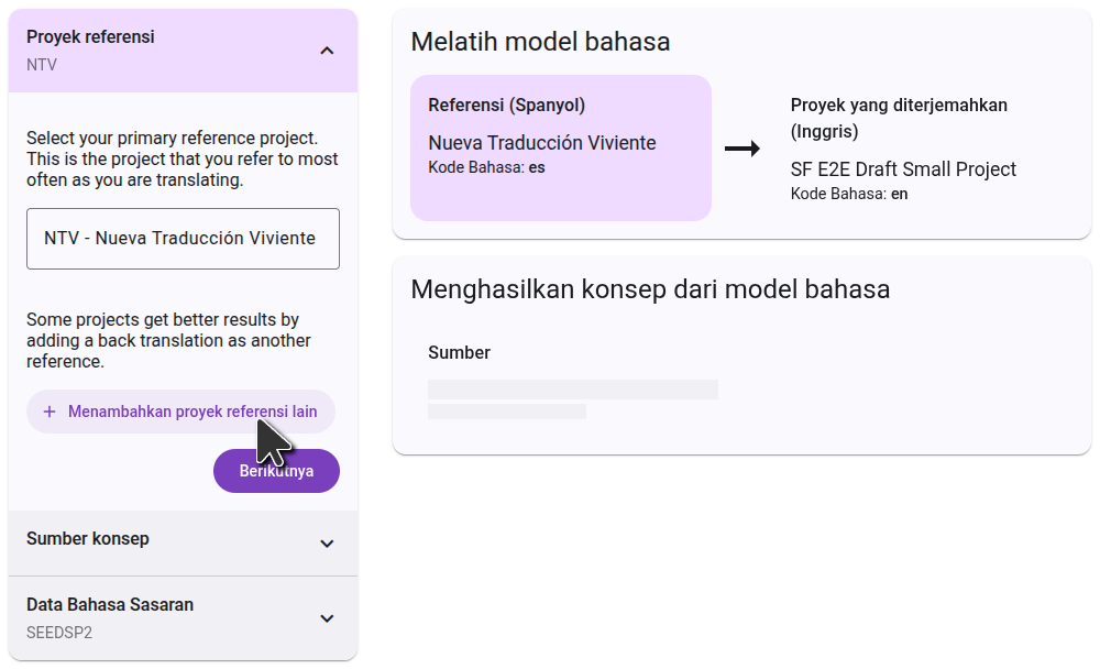 On the right side, you will see a diagram of how the projects you selected will be used to generate the draft. In the first step, the language model will learn by comparing the reference projects to the translated project. In the second step, it will use that knowledge to translate the source project.