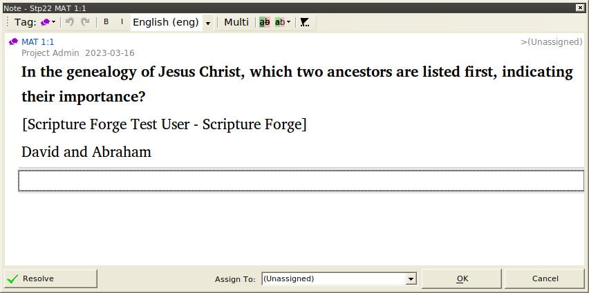 Notes generated from community checking answers will have a unique note tag, with an icon that is different from other notes in your Paratext project. You can change the icon by editing the note tag. For details, see the Paratext help article on custom note tags. You can also filter notes by their note tag, allowing you to show only community checking responses, or hide them from view altogether.