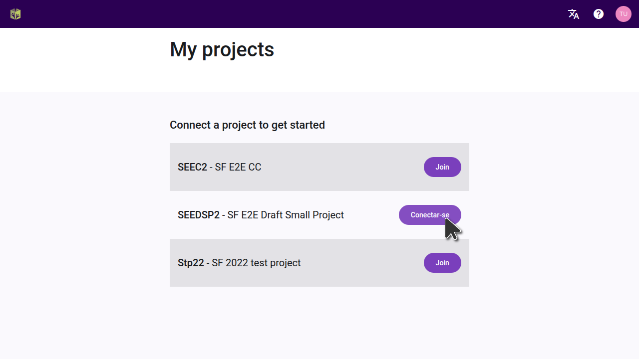 From the displayed list, you shall be able to Open projects if they are already connected. You can also join a project or click on “Connect” to connect a project for the first time in Scripture Forge.
