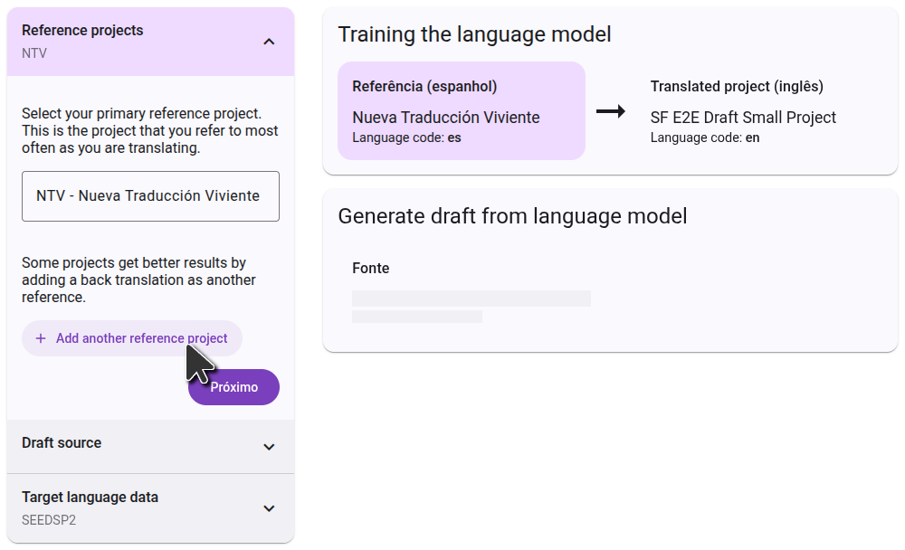 On the right side, you will see a diagram of how the projects you selected will be used to generate the draft. In the first step, the language model will learn by comparing the reference projects to the translated project. In the second step, it will use that knowledge to translate the source project.